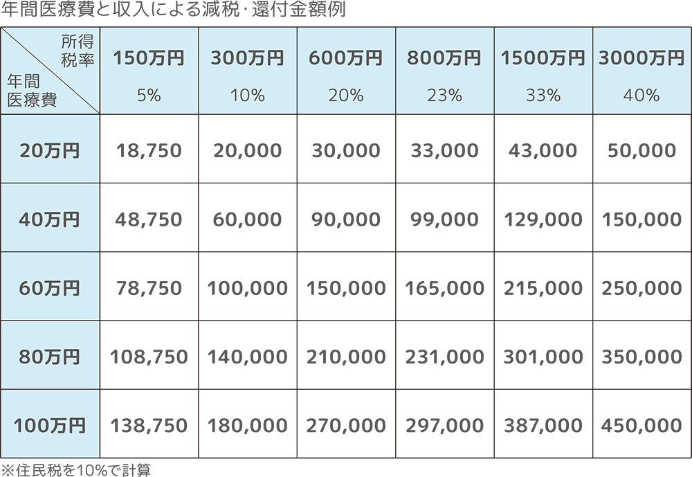 実際に還付される金額は、医療費控除額×所得税率(所得によって変わる)と、医療費控除額×住民税(10%)を合わせた額となります。